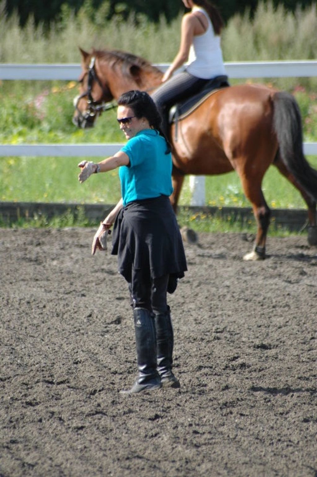 OK, we know they're not perfect all the time. So if needed, like here (read: all four feet off the ground), Karen will hop up in a lesson or clinic and help bring things back to blissfulness.